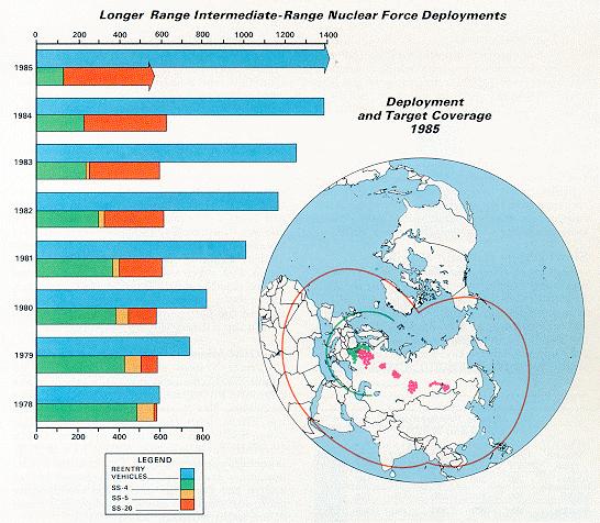 With the initial deployment of the SS-20 LRINF missile in 1977, the Soviets launched a concerted effort to modernize and expand their intermediate-range nuclear force. Each SS-20 carries three MIRVs, thereby providing a significant force expansion factor even as the older single-RV SS-4 is withdrawn. The SS-20 also has significant improvements in accuracy and reaction time over the older missiles they are replacing.