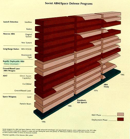 For example, the Soviet laser research program, with ballistic missile defense applicability, has historically been much larger than its US counterpart. At Sary Shagan, one of a half-dozen major R&D facilities involved in laser research, the Soviets are believed to be developing several lasers for strategic applications such as air defense or a terminal ABM, and at least one laser believed capable of an antisatellite mission.